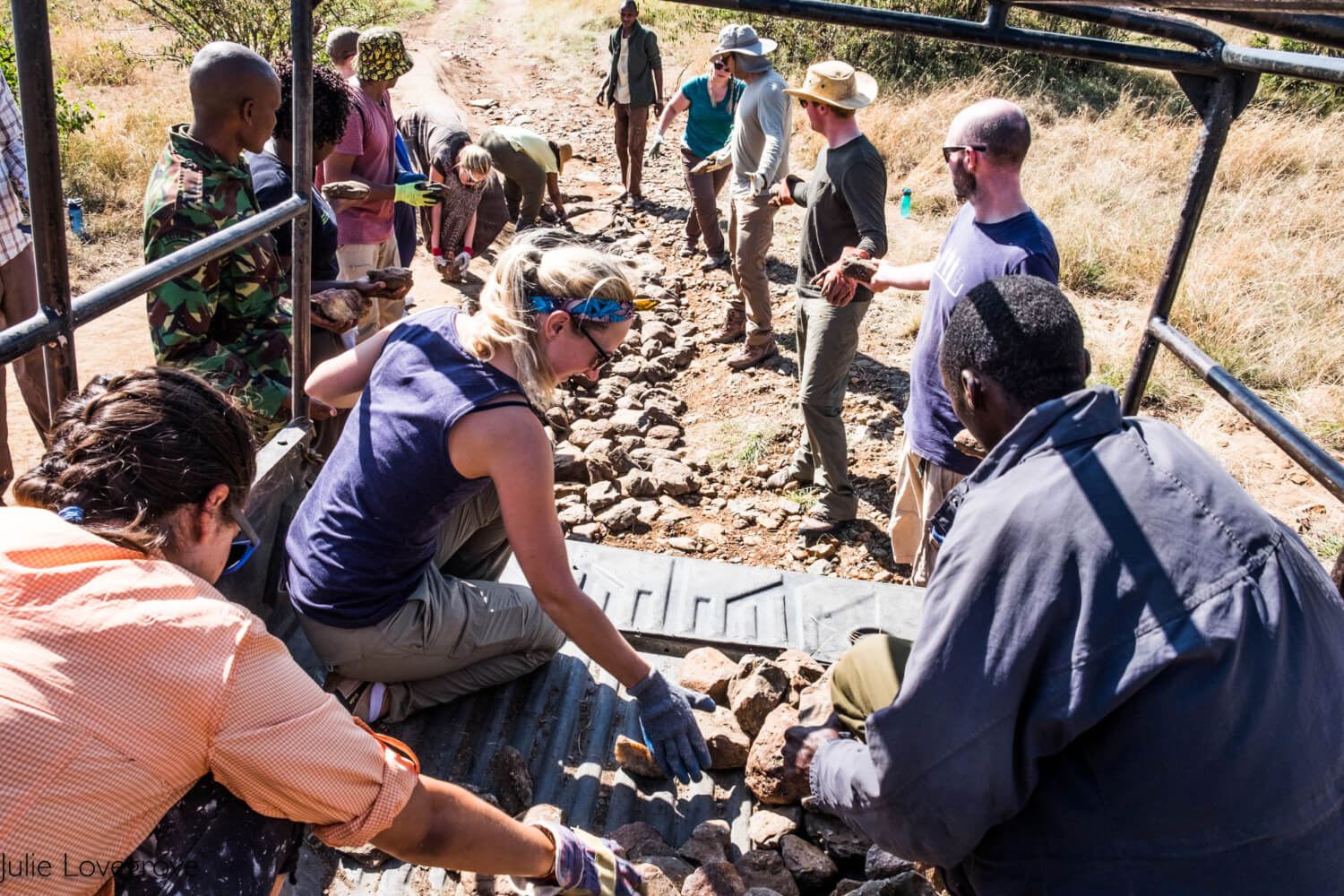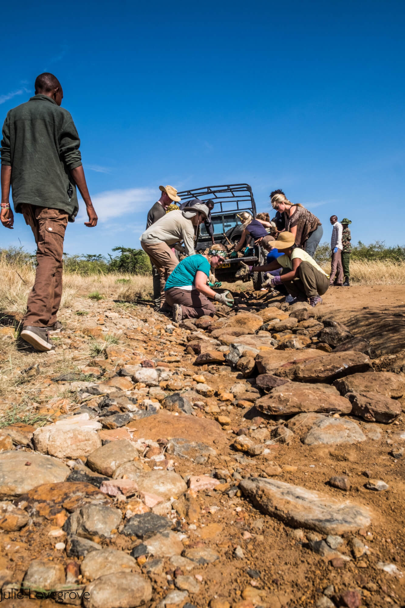One of our conservation tasks on the Mara project is to help with repairing ‘roads’. Our work entailed gathering rocks from various areas and placing them in the ruts made by vehicles on a track so that it will still be passable when it rains and the track turns to mud.