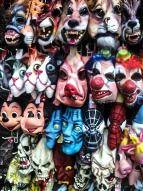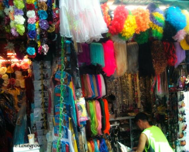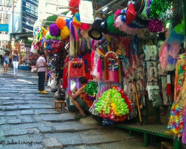 One of my favourite streets – Pottinger Street. A series of steps with little stalls at the side selling ribbons, buttons, sequins, zips, wigs, feather boas, masks etc etc. Everything you could want for accessorising costumes and adding to your sewing box.