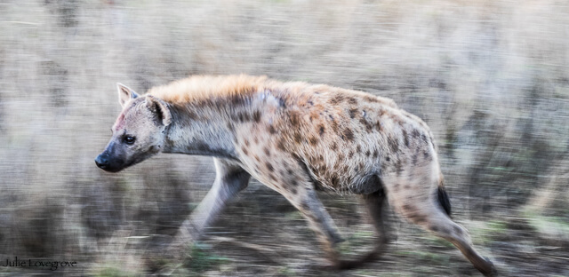 We’ve attempted motion blur – with varying degrees of frustration and success. Motion blur is when you set your camera to a slow shutter speed, and pan with a moving object or subject, or in our case, moving animal. The hard bit is that you can’t pre-determine just how fast they will move, so don’t know how fast to pan the camera. It takes a lot of trial and effort and most of the shots are rubbish! Here are my more successful efforts.